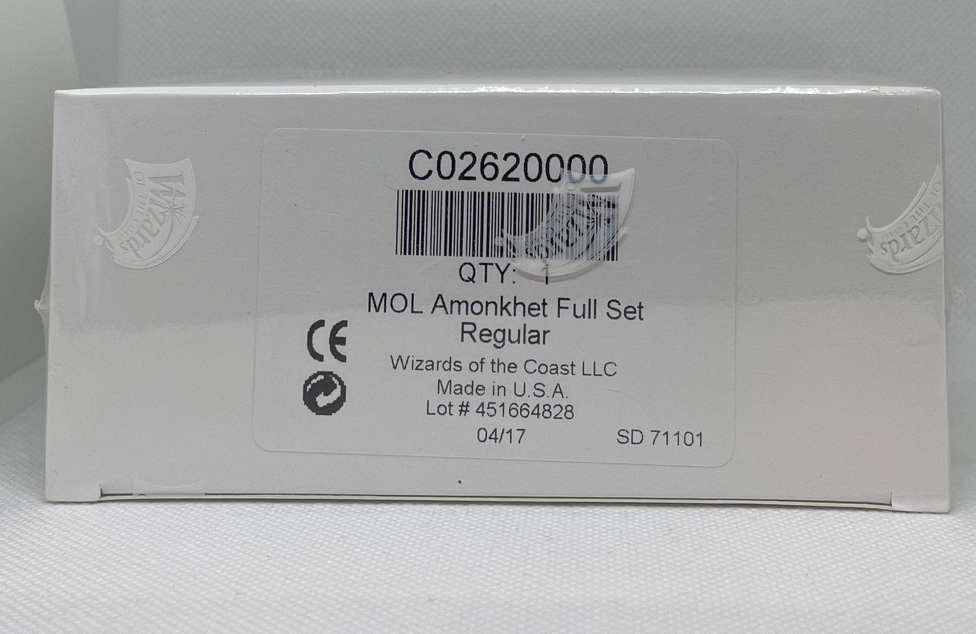One of each non-foil card in from the main set of the Amonkhet expansion set for Magic: The Gathering (MTG). Still wrapped in its factory seal, these complete sets were provided as Magic Online redemption sets, or to Wizards of the Coast employees through the employee store. Note: "booster fun" alternative art styles are typically excluded from the factory set.