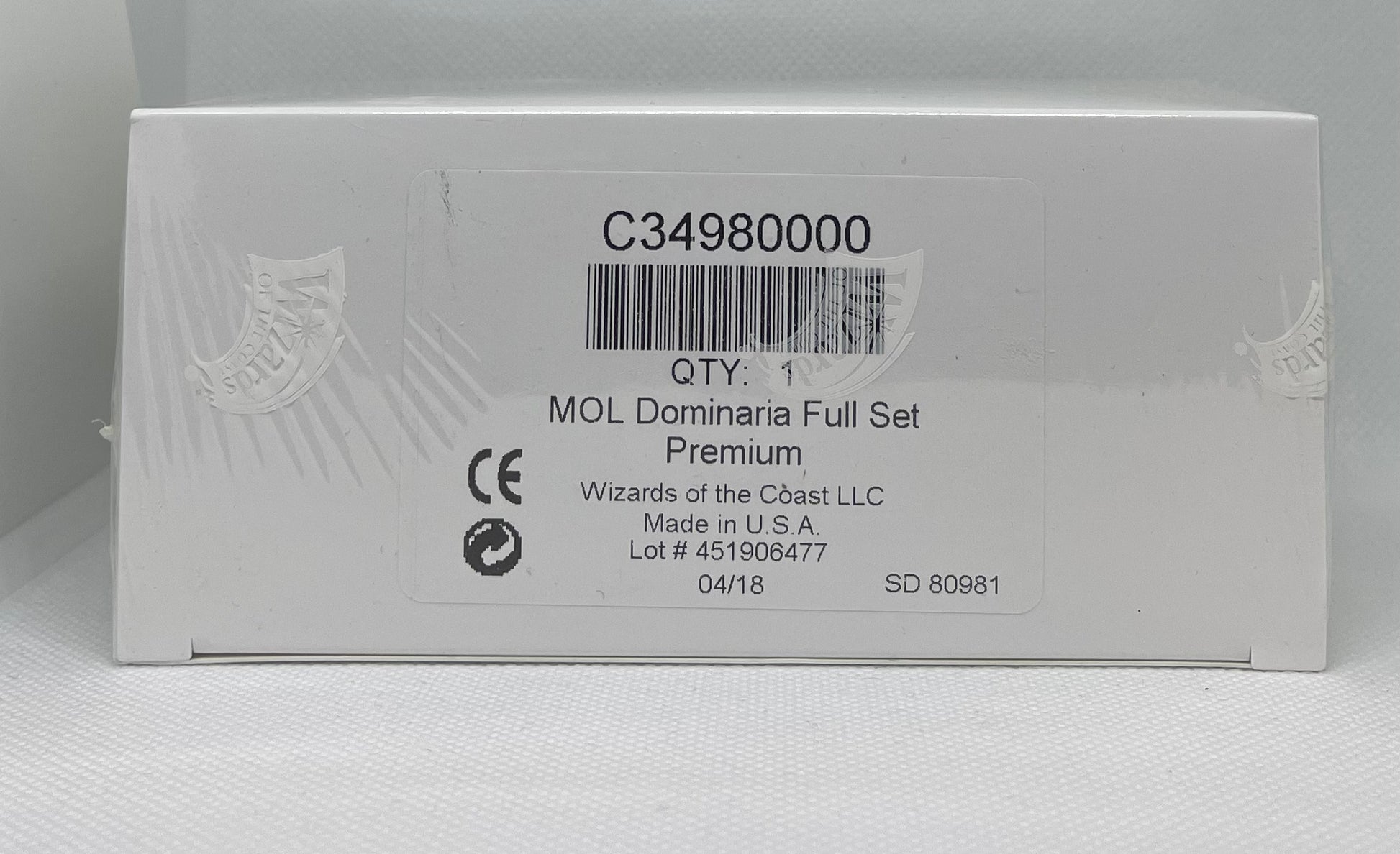 One of each foil card in from the main set of the Dominaria expansion set for Magic: The Gathering (MTG). Still wrapped in its factory seal, these complete sets were provided as Magic Online redemption sets, or to Wizards of the Coast employees through the employee store. Note: "booster fun" alternative art styles are typically excluded from the factory set.