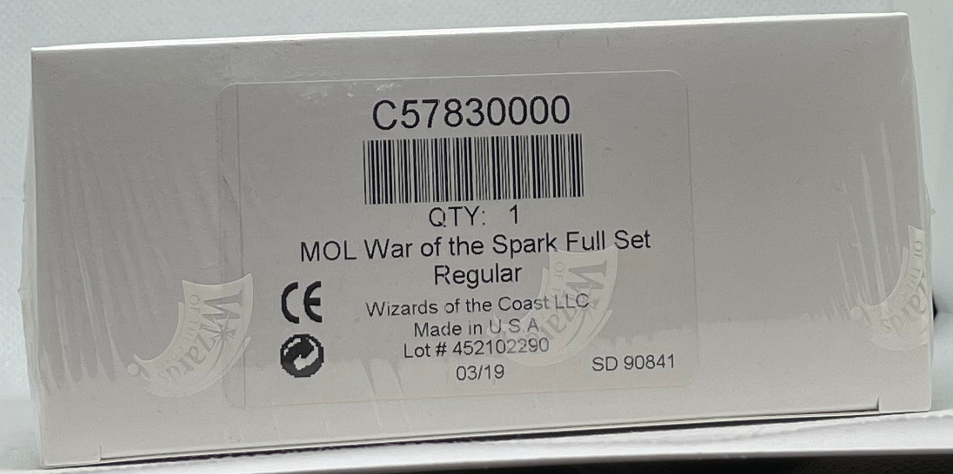 One of each non-foil card in from the main set of the War of the Spark expansion set for Magic: The Gathering (MTG). Still wrapped in its factory seal, these complete sets were provided as Magic Online redemption sets, or to Wizards of the Coast employees through the employee store. Note: "booster fun" alternative art styles are typically excluded from the factory set.