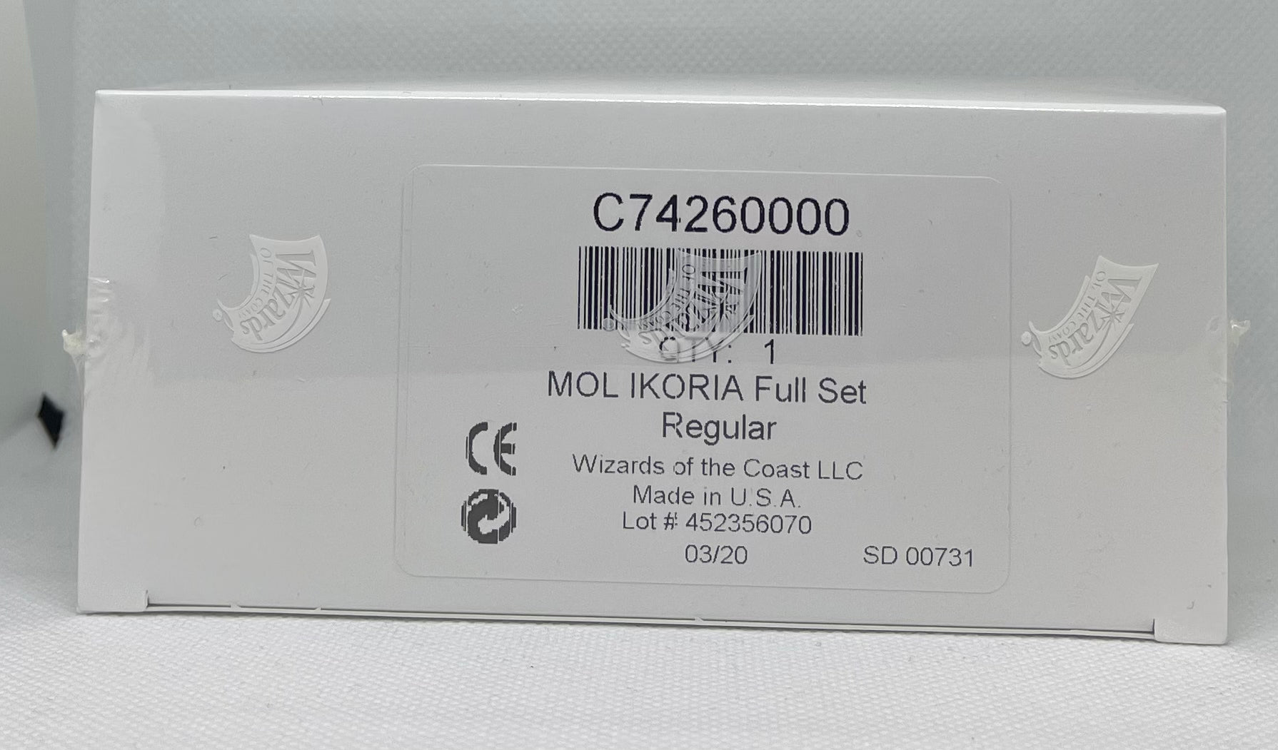 One of each non-foil card in from the main set of the Ikoria expansion set for Magic: The Gathering (MTG). Still wrapped in its factory seal, these complete sets were provided as Magic Online redemption sets, or to Wizards of the Coast employees through the employee store. Note: "booster fun" alternative art styles are typically excluded from the factory set.