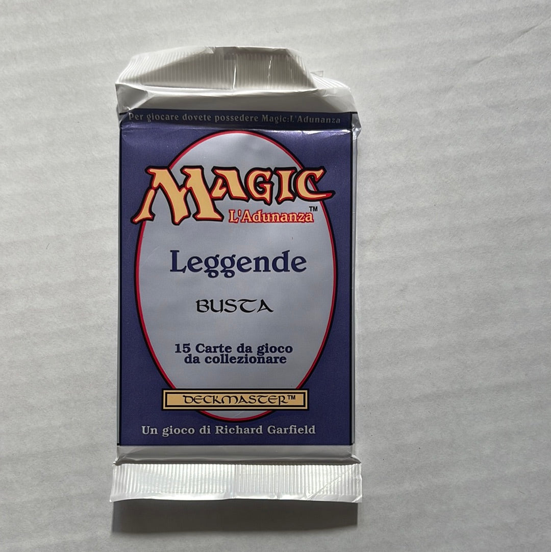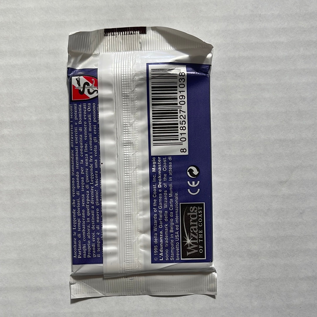 This rare, sealed Italian Legends booster pack was released in 1995. It was given to employees at Wizards to celebrate the 25th anniversary of Magic: The Gathering. This product is sealed and unsearched.