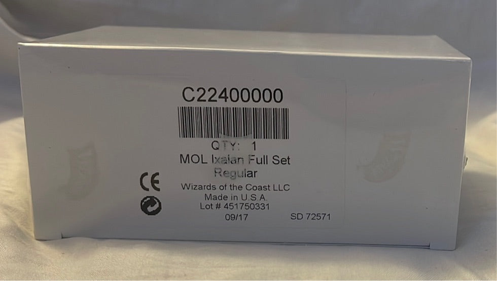 One of each non-foil card in from the main set of the Ixalan expansion set for Magic: The Gathering (MTG). Still wrapped in its factory seal, these complete sets were provided as Magic Online redemption sets, or to Wizards of the Coast employees through the employee store. Note: "booster fun" alternative art styles are typically excluded from the factory set.