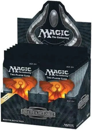 This item is a sealed display of Magic 2013 Booster Battle Packs. It contains 12 booster battle packs. Inside each is a booster pack of Magic 2013 and two color-specific groups of cards as well as basic lands.