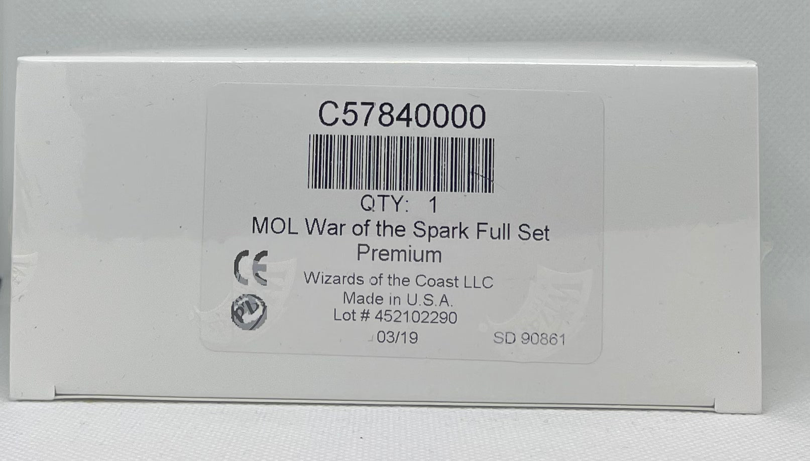 One of each foil card in from the main set of the War of the Spark expansion set for Magic: The Gathering (MTG). Still wrapped in its factory seal, these complete sets were provided as Magic Online redemption sets, or to Wizards of the Coast employees through the employee store. Note: "booster fun" alternative art styles are typically excluded from the factory set.